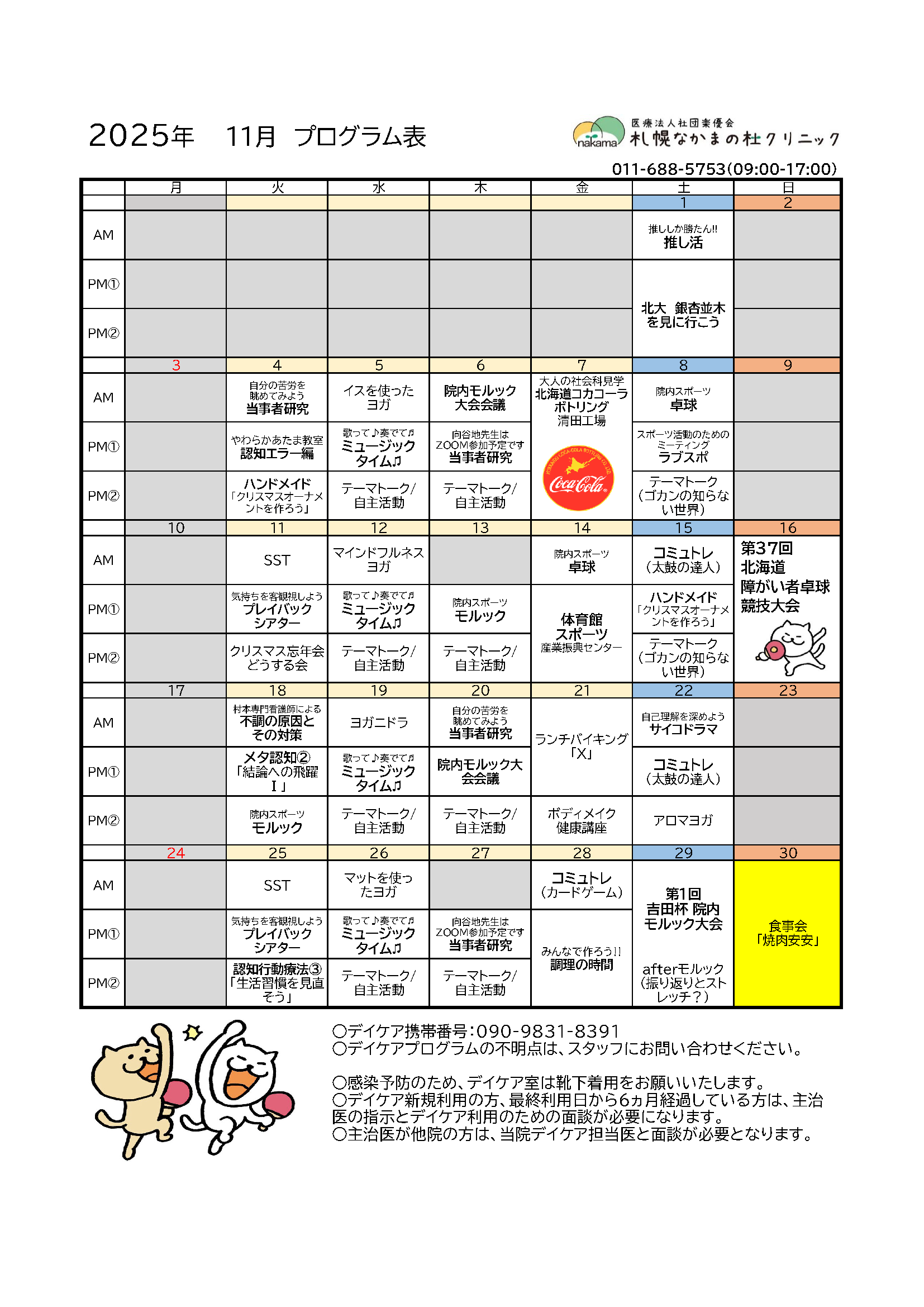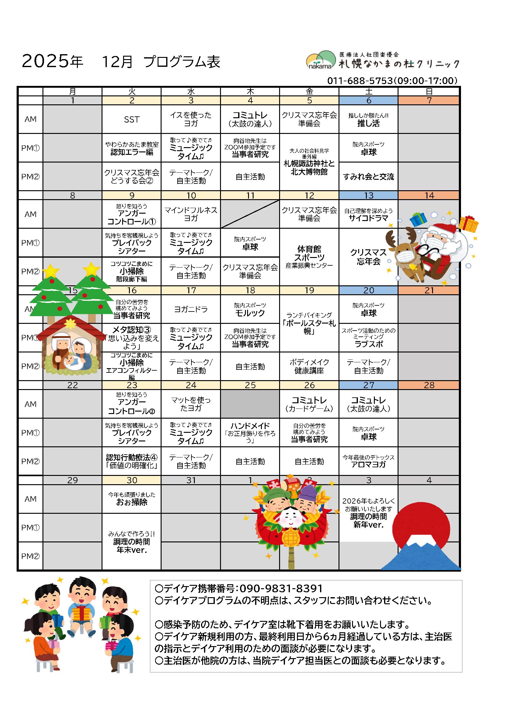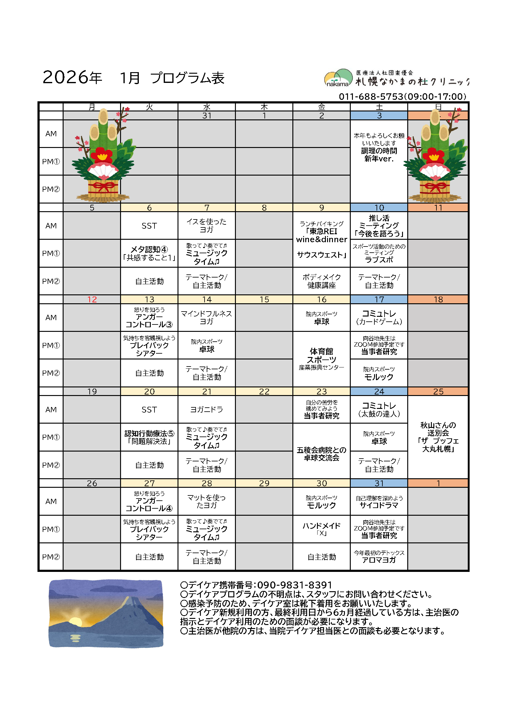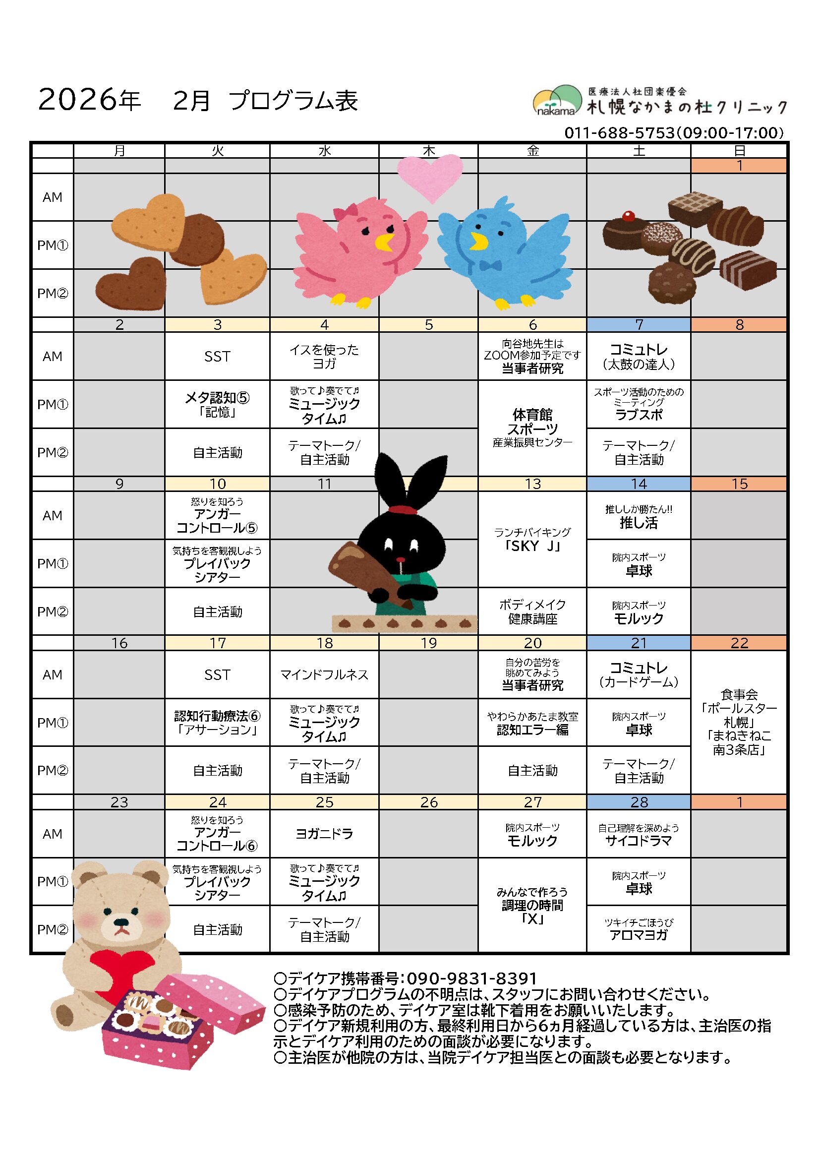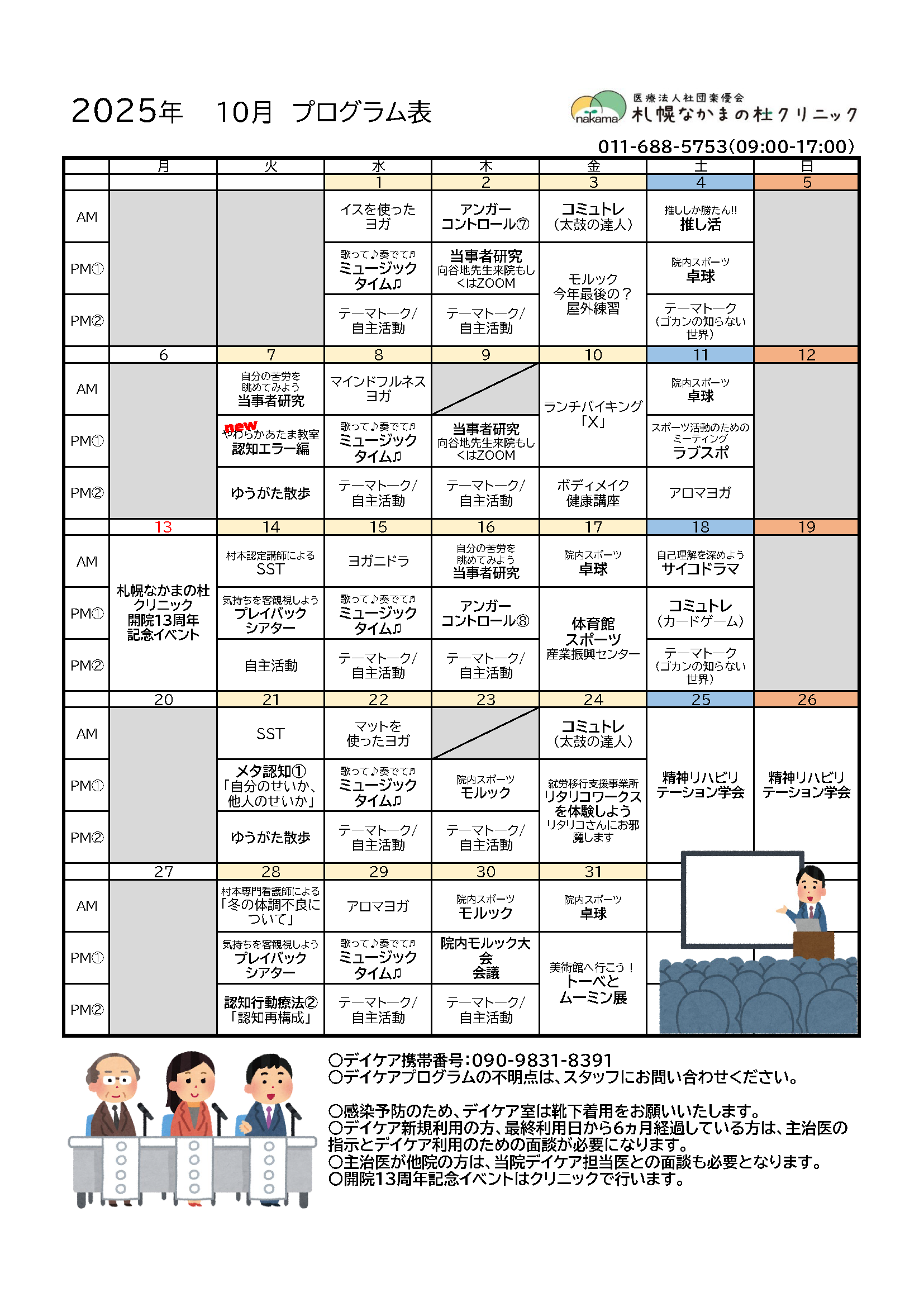 そのために薬の処方はもちろん、SST(社会生活技能訓練)や当事者研究を治療の手法として積極的に取り入れたり、多くの仲間と“出会い、ふれあい、わかち合う”機会も提供したいと考えています。宜しくお願い致します。